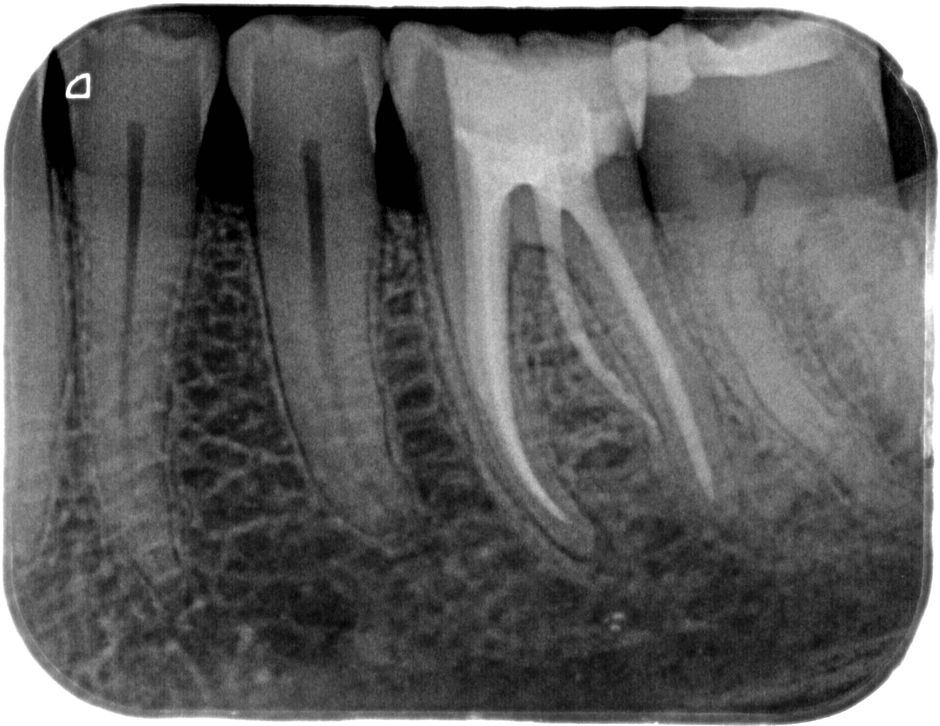 BF_36 (1 von 1)-2 Veröffentlicht 10. März 2014 am 1931 × 1491 in Wann ist ein DVT sinnvoll (3) – Zahn 36 mit radix entomolaris und Instrumentenfragmenten – Die WF Zahn 36- orthograde WF – Kontrollaufnahme